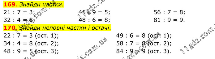 169. Знайди частки. 21 : 7 = 3; 32 : 4 = 8; 45 : 9 = 5; 48 : 6 = 8; 56 : 7 = 8; 81 : 9 = 9. 170. Знайди неповні частки і остачі. 22 : 7 = 3 (ост. 1); 34 : 4 = 8 (ост. 2); 48 : 9 = 5 (ост. 3); 49 : 6 = 8 (ост. 1); 58 : 7 = 8 (ост. 2); 84 : 9 = 9 (ост. 3).