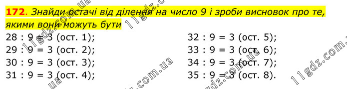 Знайди остачі від ділення на число 9 і зроби висновок про те, якими вони можуть бути 28 : 9 = 3 (ост. 1); 29 : 9 = 3 (ост. 2); 30 : 9 = 3 (ост. 3); 31 : 9 = 3 (ост. 4); 32 : 9 = 3 (ост. 5); 33 : 9 = 3 (ост. 6); 34 : 9 = 3 (ост. 7); 35 : 9 = 3 (ост. 8).