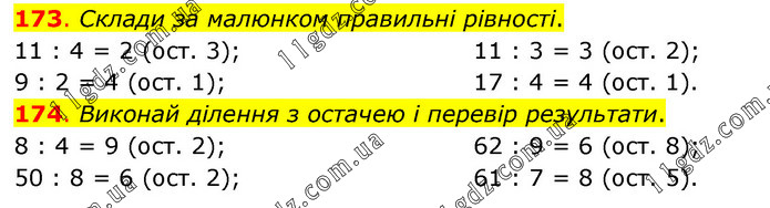 173. Склади за малюнком правильні рівності. 11 : 4 = 2 (ост. 3); 9 : 2 = 4 (ост. 1); 11 : 3 = 3 (ост. 2); 17 : 4 = 4 (ост. 1). 174. Виконай ділення з остачею і перевір результати. 8 : 4 = 9 (ост. 2); 50 : 8 = 6 (ост. 2); 62 : 9 = 6 (ост. 8); 61 : 7 = 8 (ост. 5).
