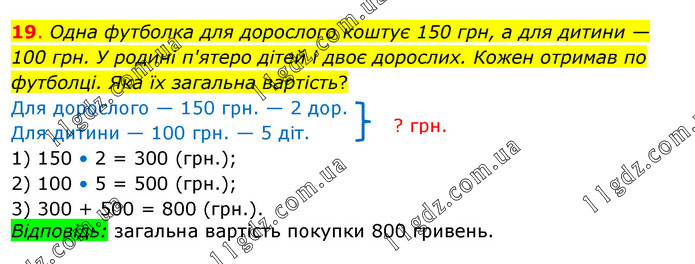 Одна футболка для дорослого коштує 150 грн, а для дитини — 100 грн. У родині п'ятеро дітей і двоє дорослих. Кожен отримав по футболці. Яка їх загальна вартість? Для дорослого — 150 грн. — 2 дор. Для дитини — 100 грн. — 5 діт. 1) 150 • 2 = 300 (грн.); 2) 100 • 5 = 500 (грн.); 3) 300 + 500 = 800 (грн.). Відповідь: загальна вартість покупки 800 гривень.