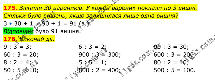 175. Зліпили 30 вареників. У кожен вареник поклали по 3 вишні. Скільки було вишень, якщо залишилася лише одна вишня? 3 • 30 + 1 = 90 + 1 = 91 (в.) Відповідь: було 91 вишня. 176. Виконай дії. 9 : 3 = 3; 60 : 3 = 20; 8 : 2 = 4; 50 : 5 = 10; 6 : 3 = 2; 900 : 3 = 300; 5 : 5 = 1; 800 : 2 = 400; 90 : 3 = 30; 600 : 3 = 200; 80 : 2 = 40; 500 : 5 = 100.