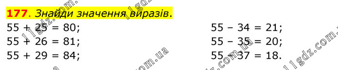 Знайди значення виразів. 55 + 25 = 80; 55 + 26 = 81; 55 + 29 = 84; 55 – 34 = 21; 55 – 35 = 20; 55 – 37 = 18.