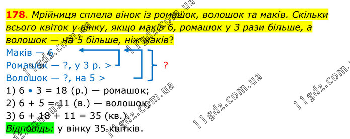 Мрійниця сплела вінок із ромашок, волошок та маків. Скільки всього квіток у вінку, якщо маків 6, ромашок у 3 рази більше, а волошок — на 5 більше, ніж маків? Маків — 6 Ромашок — ?, у 3 р. > ? Волошок — ?, на 5 > 1) 6 • 3 = 18 (р.) — ромашок; 2) 6 + 5 = 11 (в.) — волошок; 3) 6 + 18 + 11 = 35 (кв.). Відповідь: у вінку 35 квітків.