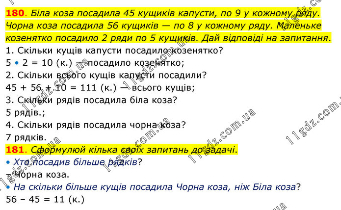 180. Біла коза посадила 45 кущиків капусти, по 9 у кожному ряду. Чорна коза посадила 56 кущиків — по 8 у кожному ряду. Маленьке козенятко посадило 2 ряди по 5 кущиків. Дай відповіді на запитання. 1. Скільки кущів капусти посадило козенятко? 5 • 2 = 10 (к.) — посадило козенятко; 2. Скільки всього кущів капусти посадили? 45 + 56 + 10 = 111 (к.) — всього кущів; 3. Скільки рядів посадила біла коза? 5 рядів.; 4. Скільки рядів посадила чорна коза? 7 рядків. 181. Сформулюй кілька своїх запитань до задачі. • Хто посадив більше рядків? – Чорна коза. • На скільки більше кущів посадила Чорна коза, ніж Біла коза? 56 – 45 = 11 (к.)