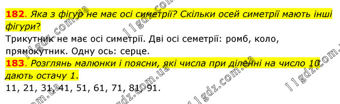 182. Яка з фігур не має осі симетрії? Скільки осей симетрії мають інші фігури? Трикутник не має осі симетрії. Дві осі семетрії: ромб, коло, прямокутник. Одну ось: серце. 183. Розглянь малюнки і поясни, які числа при діленні на число 10 дають остачу 1. 11, 21, 31, 41, 51, 61, 71, 81, 91.