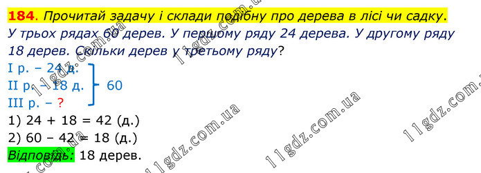 Прочитай задачу і склади подібну про дерева в лісі чи садку. У трьох рядах 60 дерев. У першому ряду 24 дерева. У другому ряду 18 дерев. Скільки дерев у третьому ряду? І р. – 24 д. ІІ р. – 18 д. 60 ІІІ р. – ? 1) 24 + 18 = 42 (д.) 2) 60 – 42 = 18 (д.) Відповідь: 18 дерев.