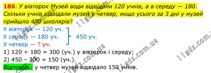 У вівторок Музей води відвідали 120 учнів, а в середу — 180. Скільки учнів відвідали музей у четвер, якщо усього за 3 дні у музей прийшло 450 школярів? У вівторок — 120 уч. У середу — 180 уч. 450 уч. У четвер — ? уч. 1) 120 + 180 = 300 (уч.) у вівторок і середу; 2) 450 – 300 = 150 (уч.). Відповідь: у четвер музей відвідало 150 учнів.