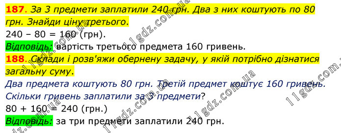 187. За 3 предмети заплатили 240 грн. Два з них коштують по 80 грн. Знайди ціну третього. 240 – 80 = 160 (грн). Відповідь: вартість третього предмета 160 гривень. 188. Склади і розв'яжи обернену задачу, у якій потрібно дізнатися загальну суму. Два предмета коштують 80 грн. Третій предмет коштує 160 гривень. Скільки гривень заплатили за 3 предмети? 80 + 160 = 240 (грн.) Відповідь: за три предмети заплатили 240 грн.