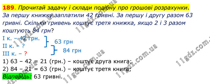 Прочитай задачу і склади подібну про грошові розрахунки. За першу книжку заплатили 42 гривні. За першу і другу разом 63 гривні. Скільки гривень коштує третя книжка, якщо 2 і 3 разом коштують 84 грн? І к. – 42 грн. ІІ к. – ? ІІІ к. – ? 1) 63 – 42 = 21 (грн.) – коштує друга книга; 2) 84 – 21 = 63 (грн.) – коштує третя книга; Відповідь: 63 гривні.