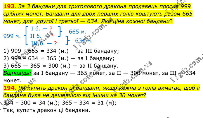 193. За 3 бандани для триголового дракона продавець просив 999 срібних монет. Бандани для двох перших голів коштують разом 665 монет, для другої і третьої — 634. Яка ціна кожної бандани? І б. — ? 999 м. ІІ б. — ? ІІІ б. — ? 1) 999 – 665 = 334 (м.) — за ІІІ бандану; 2) 999 – 634 = 365 (м.) — за І бандану; 3) 665 — 365 = 300 (м.) — за ІІ бандану. Відповідь: за І бандану — 365 монет, за ІІ — 300 монет, за ІІІ — 334 монет. 194. Чи купить дракон ці бандани, якщо кожна з голів вимагає, щоб її бандана була не дешевшою від інших на 30 монет? 334 – 300 = 34 (м.); 365 – 334 = 31 (м); Так, купить дракон ці бандани.