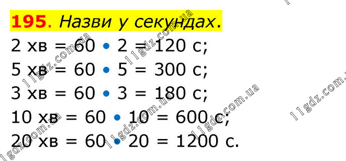 Назви у секундах. 2 хв = 60 • 2 = 120 с; 5 хв = 60 • 5 = 300 с; 3 хв = 60 • 3 = 180 с; 10 хв = 60 • 10 = 600 с; 20 хв = 60 • 20 = 1200 с.