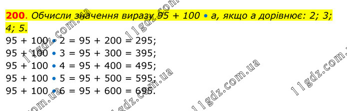 Обчисли значення виразу 95 + 100 • а, якщо а дорівнює: 2; 3; 4; 5. 95 + 100 • 2 = 95 + 200 = 295; 95 + 100 • 3 = 95 + 300 = 395; 95 + 100 • 4 = 95 + 400 = 495; 95 + 100 • 5 = 95 + 500 = 595; 95 + 100 • 6 = 95 + 600 = 695.