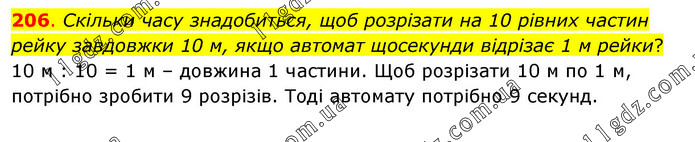 Скільки часу знадобиться, щоб розрізати на 10 рівних частин рейку завдовжки 10 м, якщо автомат щосекунди відрізає 1 м рейки? 10 м : 10 = 1 м – довжина 1 частини. Щоб розрізати 10 м по 1 м, потрібно зробити 9 розрізів. Тоді автомату потрібно 9 секунд.
