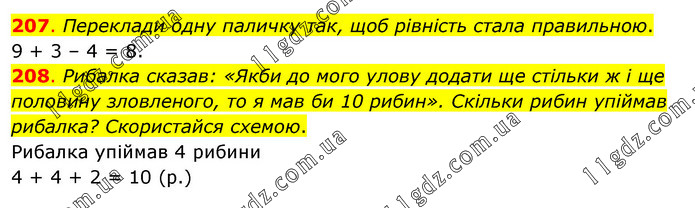 207. Переклади одну паличку так, щоб рівність стала правильною. 9 + 3 – 4 = 8. 208. Рибалка сказав: «Якби до мого улову додати ще стільки ж і ще половину зловленого, то я мав би 10 рибин». Скільки рибин упіймав рибалка? Скористайся схемою. Рибалка упіймав 4 рибини 4 + 4 + 2 = 10 (р.)