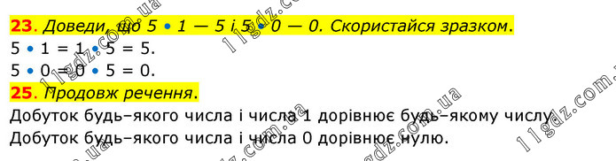 23. Доведи, що 5 • 1 — 5 і 5 • 0 — 0. Скористайся зразком. 5 • 1 = 1 • 5 = 5. 5 • 0 = 0 • 5 = 0. 25. Продовж речення. Добуток будь–якого числа і числа 1 дорівнює будь–якому числу. Добуток будь–якого числа і числа 0 дорівнює нулю.