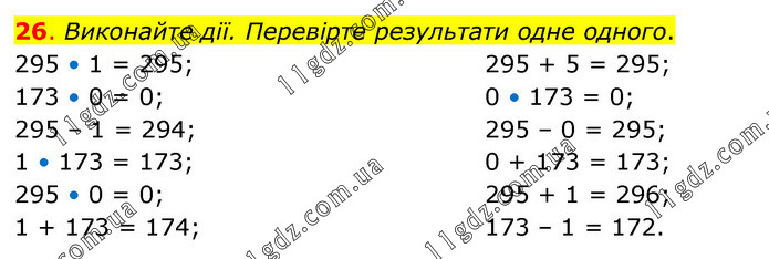 Виконайте дії. Перевірте результати одне одного. 295 • 1 = 295; 173 • 0 = 0; 295 – 1 = 294; 1 • 173 = 173; 295 • 0 = 0; 1 + 173 = 174; 295 + 5 = 295; 0 • 173 = 0; 295 – 0 = 295; 0 + 173 = 173; 295 + 1 = 296; 173 – 1 = 172.