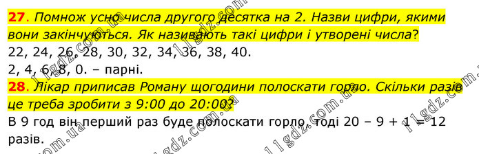 27. Помнож усно числа другого десятка на 2. Назви цифри, якими вони закінчуються. Як називають такі цифри і утворені числа? 22, 24, 26, 28, 30, 32, 34, 36, 38, 40. 2, 4, 6, 8, 0. – парні. 28. Лікар приписав Роману щогодини полоскати горло. Скільки разів це треба зробити з 9:00 до 20:00? В 9 год він перший раз буде полоскати горло, тоді 20 – 9 + 1 = 12 разів.