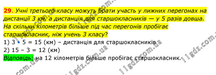 Учні третього класу можуть брати участь у лижних перегонах на дистанції 3 км, а дистанція для старшокласників — у 5 разів довша. На скільки кілометрів більше під час перегонів пробігає старшокласник, ніж учень 3 класу? 1) 3 • 5 = 15 (км) – дистанція для старшокласників 2) 15 – 3 = 12 (км) Відповідь: на 12 кілометрів більше пробігає старшокласник.