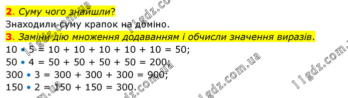 2. Суму чого знайшли? Знаходили суму крапок на доміно. 3. Заміни дію множення додаванням і обчисли значення виразів. 10 • 5 = 10 + 10 + 10 + 10 + 10 = 50; 50 • 4 = 50 + 50 + 50 + 50 = 200; 300 • 3 = 300 + 300 + 300 = 900; 150 • 2 = 150 + 150 = 300.