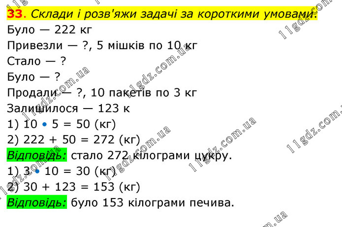 Склади і розв'яжи задачі за короткими умовами. Було — 222 кг Привезли — ?, 5 мішків по 10 кг Стало — ? Було — ? Продали — ?, 10 пакетів по 3 кг Залишилося — 123 к 1) 10 • 5 = 50 (кг) 2) 222 + 50 = 272 (кг) Відповідь: стало 272 кілограми цукру. 1) 3 • 10 = 30 (кг) 2) 30 + 123 = 153 (кг) Відповідь: було 153 кілограми печива.