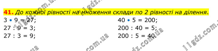 До кожної рівності на множення склади по 2 рівності на ділення. 3 • 9 = 27; 27 : 9 = 3; 27 : 3 = 9; 40 • 5 = 200; 200 : 40 = 5; 200 : 5 = 40.
