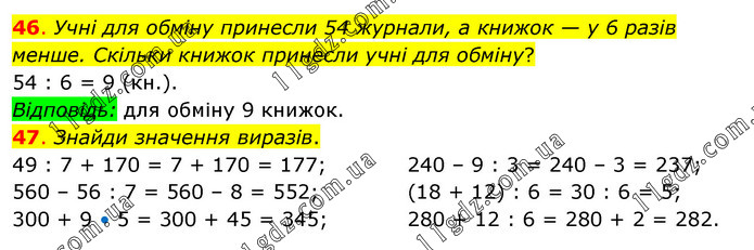 46. Учні для обміну принесли 54 журнали, а книжок — у 6 разів менше. Скільки книжок принесли учні для обміну? 54 : 6 = 9 (кн.). Відповідь: для обміну 9 книжок. 47. Знайди значення виразів. 49 : 7 + 170 = 7 + 170 = 177; 560 – 56 : 7 = 560 – 8 = 552; 300 + 9 • 5 = 300 + 45 = 345; 240 – 9 : 3 = 240 – 3 = 237; (18 + 12) : 6 = 30 : 6 = 5; 280 + 12 : 6 = 280 + 2 = 282.