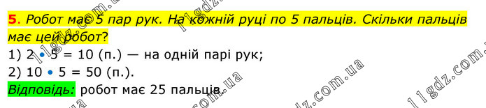 Робот має 5 пар рук. На кожній руці по 5 пальців. Скільки пальців має цей робот? 1) 2 • 5 = 10 (п.) — на одній парі рук; 2) 10 • 5 = 50 (п.). Відповідь: робот має 25 пальців.