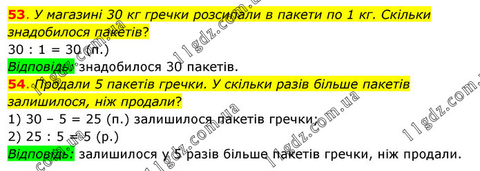 53. У магазині 30 кг гречки розсипали в пакети по 1 кг. Скільки знадобилося пакетів? 30 : 1 = 30 (п.) Відповідь: знадобилося 30 пакетів. 54. Продали 5 пакетів гречки. У скільки разів більше пакетів залишилося, ніж продали? 1) 30 – 5 = 25 (п.) залишилося пакетів гречки; 2) 25 : 5 = 5 (р.) Відповідь: залишилося у 5 разів більше пакетів гречки, ніж продали.