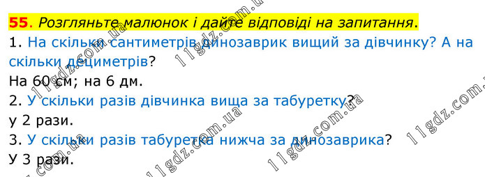 Розгляньте малюнок і дайте відповіді на запитання. 1. На скільки сантиметрів динозаврик вищий за дівчинку? А на скільки дециметрів? На 60 см; на 6 дм. 2. У скільки разів дівчинка вища за табуретку? у 2 рази. 3. У скільки разів табуретка нижча за динозаврика? У 3 рази.