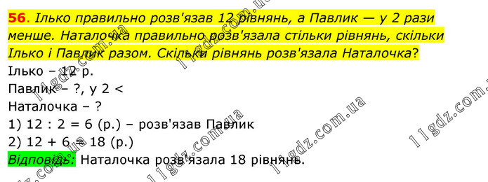 Ілько правильно розв'язав 12 рівнянь, а Павлик — у 2 рази менше. Наталочка правильно розв'язала стільки рівнянь, скільки Ілько і Павлик разом. Скільки рівнянь розв'язала Наталочка? Ілько – 12 р. Павлик – ?, у 2 < Наталочка – ? 1) 12 : 2 = 6 (р.) – розв'язав Павлик 2) 12 + 6 = 18 (р.) Відповідь: Наталочка розв'язала 18 рівнянь.