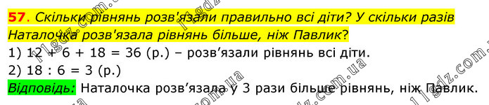 Скільки рівнянь розв'язали правильно всі діти? У скільки разів Наталочка розв'язала рівнянь більше, ніж Павлик? 1) 12 + 6 + 18 = 36 (р.) – розв’язали рівнянь всі діти. 2) 18 : 6 = 3 (р.) Відповідь: Наталочка розв’язала у 3 рази більше рівнянь, ніж Павлик.