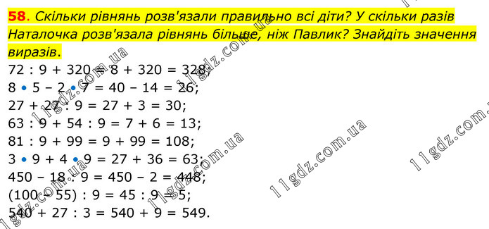 Скільки рівнянь розв'язали правильно всі діти? У скільки разів Наталочка розв'язала рівнянь більше, ніж Павлик? Знайдіть значення виразів. 72 : 9 + 320 = 8 + 320 = 328; 8 • 5 – 2 • 7 = 40 – 14 = 26; 27 + 27 : 9 = 27 + 3 = 30; 63 : 9 + 54 : 9 = 7 + 6 = 13; 81 : 9 + 99 = 9 + 99 = 108; 3 • 9 + 4 • 9 = 27 + 36 = 63; 450 – 18 : 9 = 450 – 2 = 448; (100 – 55) : 9 = 45 : 9 = 5; 540 + 27 : 3 = 540 + 9 = 549.