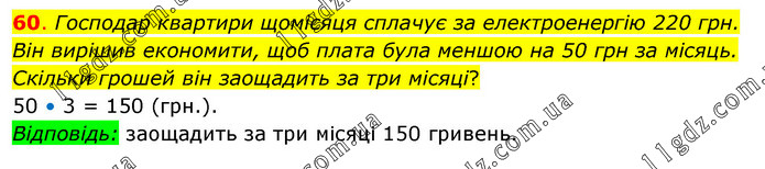 Господар квартири щомісяця сплачує за електроенергію 220 грн. Він вирішив економити, щоб плата була меншою на 50 грн за місяць. Скільки грошей він заощадить за три місяці? 50 • 3 = 150 (грн.). Відповідь: заощадить за три місяці 150 гривень.
