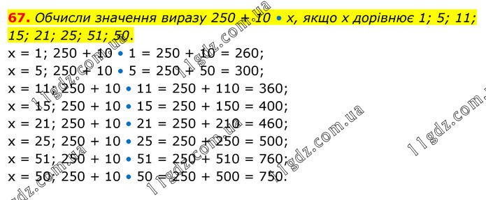 Обчисли значення виразу 250 + 10 • х, якщо х дорівнює 1; 5; 11; 15; 21; 25; 51; 50. х = 1; 250 + 10 • 1 = 250 + 10 = 260; х = 5; 250 + 10 • 5 = 250 + 50 = 300; х = 11; 250 + 10 • 11 = 250 + 110 = 360; х = 15; 250 + 10 • 15 = 250 + 150 = 400; х = 21; 250 + 10 • 21 = 250 + 210 = 460; х = 25; 250 + 10 • 25 = 250 + 250 = 500; х = 51; 250 + 10 • 51 = 250 + 510 = 760; х = 50; 250 + 10 • 50 = 250 + 500 = 750.