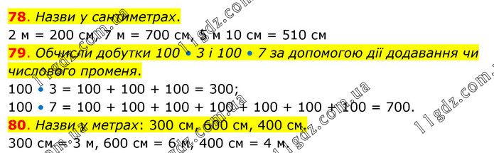 78. Назви у сантиметрах. 2 м = 200 см, 7 м = 700 см, 5 м 10 см = 510 см 79. Обчисли добутки 100 • 3 і 100 • 7 за допомогою дії додавання чи числового променя. 100 • 3 = 100 + 100 + 100 = 300; 100 • 7 = 100 + 100 + 100 + 100 + 100 + 100 + 100 = 700. 80. Назви у метрах: 300 см, 600 см, 400 см. 300 см = 3 м, 600 см = 6 м, 400 см = 4 м.