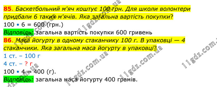 85. Баскетбольний м'яч коштує 100 грн. Для школи волонтери придбали 6 таких м'ячів. Яка загальна вартість покупки? 100 • 6 = 600 (грн.) Відповідь: загальна вартість покупки 600 гривень 86. Маса йогурту в одному стаканчику 100 г. В упаковці — 4 стаканчики. Яка загальна маса йогурту в упаковці? 1 ст. – 100 г 4 ст. – ? г 100 • 4 = 400 (г). Відповідь: загальна маса йогурту 400 грамів.