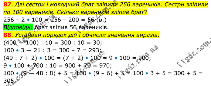87. Дві сестри і молодший брат зліпили 256 вареників. Сестри зліпили по 100 вареників. Скільки вареників зліпив брат? 256 – 2 • 100 = 256 – 200 = 56 (в.) Відповідь: брат зліпив 56 вареників. 88. Установи порядок дій і обчисли значення виразів. (400 — 100) : 10 = 300 : 10 = 30; 100 • 3 — 21 : 3 = 300 – 7 = 293; (49 : 7 + 2) • 100 = (7 + 2) • 100 = 9 • 100 = 900; 9 • 100 + 700 : 10 = 900 + 70 = 970; 100 • (9 — 48 : 8) + 5 = 100 • (9 – 6) + 5 = 100 • 3 + 5 = 300 + 5 = 305.