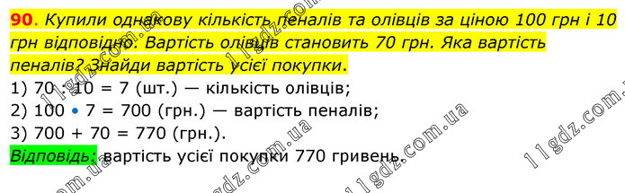 Купили однакову кількість пеналів та олівців за ціною 100 грн і 10 грн відповідно. Вартість олівців становить 70 грн. Яка вартість пеналів? Знайди вартість усієї покупки. 1) 70 : 10 = 7 (шт.) — кількість олівців; 2) 100 • 7 = 700 (грн.) — вартість пеналів; 3) 700 + 70 = 770 (грн.). Відповідь: вартість усієї покупки 770 гривень.