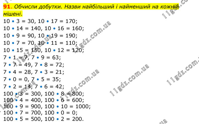 Обчисли добутки. Назви найбільший і найменший на кожній мішені. 10 • 3 = 30, 10 • 17 = 170; 10 • 14 = 140, 10 • 16 = 160; 10 • 9 = 90, 10 • 19 = 190; 10 • 7 = 70, 10 • 11 = 110; 10 • 15 = 150, 10 • 12 = 120; 7 • 1 = 7, 7 • 9 = 63; 7 • 7 = 49, 7 • 8 = 72; 7 • 4 = 28, 7 • 3 = 21; 7 • 0 = 0, 7 • 5 = 35; 7 • 2 = 14, 7 • 6 = 42; 100 • 3 = 300, 100 • 8 = 800; 100 • 4 = 400, 100 • 6 = 600; 100 • 9 = 900, 100 • 10 = 1000; 100 • 7 = 700, 100 • 0 = 0; 100 • 5 = 500, 100 • 2 = 200.