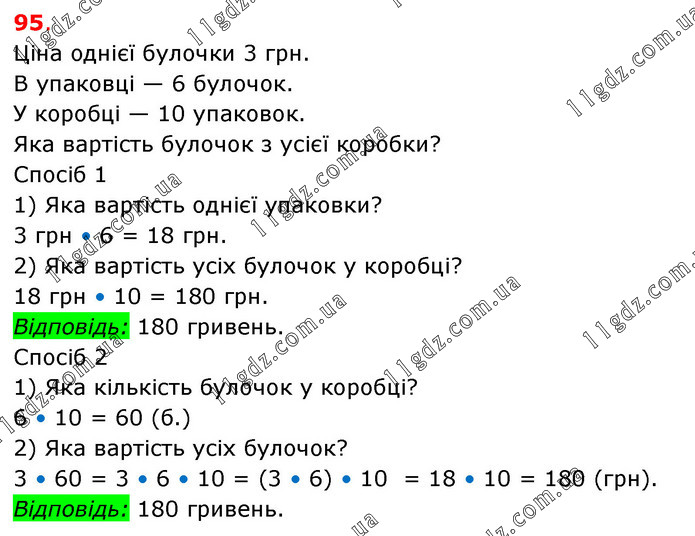 Ціна однієї булочки 3 грн. В упаковці — 6 булочок. У коробці — 10 упаковок. Яка вартість булочок з усієї коробки? Спосіб 1 1) Яка вартість однієї упаковки? 3 грн • 6 = 18 грн. 2) Яка вартість усіх булочок у коробці? 18 грн • 10 = 180 грн. Відповідь: 180 гривень. Спосіб 2 1) Яка кількість булочок у коробці? 6 • 10 = 60 (б.) 2) Яка вартість усіх булочок? 3 • 60 = 3 • 6 • 10 = (3 • 6) • 10 = 18 • 10 = 180 (грн). Відповідь: 180 гривень.