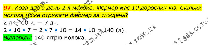 Коза дає в день 2 л молока. Фермер має 10 дорослих кіз. Скільки молока може отримати фермер за тиждень? 2 л — 10 к. — 7 дн. 2 • 10 • 7 = 2 • 7 • 10 = 14 • 10 = 140 (л). Відповідь: 140 літрів молока.