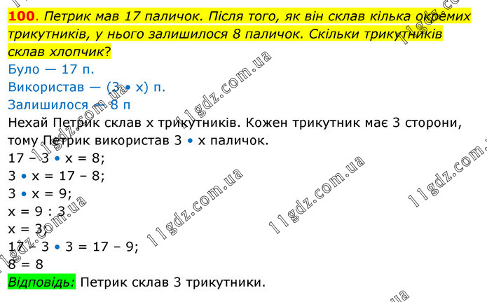 Петрик мав 17 паличок. Після того, як він склав кілька окремих трикутників, у нього залишилося 8 паличок. Скільки трикутників склав хлопчик? Було — 17 п. Використав — (3 • х) п. Залишилося — 8 п Нехай Петрик склав х трикутників. Кожен трикутник має 3 сторони, тому Петрик використав 3 • х паличок. 17 – 3 • х = 8; 3 • х = 17 – 8; 3 • х = 9; х = 9 : 3 х = 3; 17 – 3 • 3 = 17 – 9; 8 = 8 Відповідь: Петрик склав 3 трикутники.