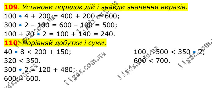 109. Установи порядок дій і знайди значення виразів. 100 • 4 + 200 = 400 + 200 = 600; 300 • 2 – 100 = 600 – 100 = 500; 100 + 70 • 2 = 100 + 140 = 240. 110. Порівняй добутки і суми. 40 • 8 < 200 + 150; 320 < 350. 300 • 2 = 120 + 480; 600 = 600. 100 + 500 < 350 • 2; 600 < 700.