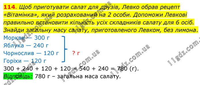 Щоб приготувати салат для друзів, Левко обрав рецепт «Вітамінка», який розрахований на 2 особи. Допоможи Левкові правильно встановити кількість усіх складників салату для 6 осіб. Знайди загальну масу салату, приготовленого Левком, без лимона. Моркви — 300 г Яблука — 240 г Чорнослив — 120 г ? г Горіхи — 120 г 300 + 240 + 120 + 120 = 540 + 240 = 780 (г). Відповідь: 780 г – загальна маса салату.