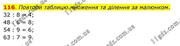 Повтори таблицю множення та ділення за малюнком. 32 : 8 = 4; 48 : 6 = 8; 54 : 9 = 6; 63 : 7 = 9.