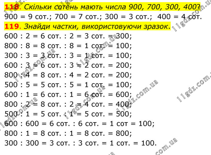 118. Скільки сотень мають числа 900, 700, 300, 400? 900 = 9 сот.; 700 = 7 сот.; 300 = 3 сот.; 400 = 4 сот. 119. Знайди частки, використовуючи зразок. 600 : 2 = 6 сот. : 2 = 3 сот. = 300; 800 : 8 = 8 сот. : 8 = 1 сот. = 100; 300 : 3 = 3 сот. : 3 = 1 сот. = 100; 600 : 3 = 6 сот. : 3 = 2 сот. = 200; 800 : 4 = 8 сот. : 4 = 2 сот. = 200; 500 : 5 = 5 сот. : 5 = 1 сот. = 100; 600 : 1 = 6 сот. : 1 = 6 сот. = 600; 800 : 2 = 8 сот. : 2 = 4 сот. = 400; 500 : 1 = 5 сот. : 1 = 5 сот. = 500; 600 : 600 = 6 сот. : 6 сот. = 1 сот = 100; 800 : 1 = 8 сот. : 1 = 8 сот. = 800; 300 : 300 = 3 сот. : 3 сот. = 1 сот. = 100.
