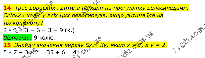 14. Троє дорослих і дитина поїхали на прогулянку велосипедами. Скільки коліс у всіх цих велосипедів, якщо дитина їде на триколісному? 2 • 3 + 3 = 6 + 3 = 9 (к.) Відповідь: 9 коліс. 15. Знайди значення виразу 5х + 3у, якщо х = 7, а у = 2. 5 • 7 + 3 • 2 = 35 + 6 = 41.