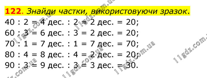 Знайди частки, використовуючи зразок. 40 : 2 = 4 дес. : 2 = 2 дес. = 20; 60 : 3 = 6 дес. : 3 = 2 дес. = 20; 70 : 1 = 7 дес. : 1 = 7 дес. = 70; 80 : 4 = 8 дес. : 4 = 2 дес. = 20; 90 : 3 = 9 дес. : 3 = 3 дес. = 30.
