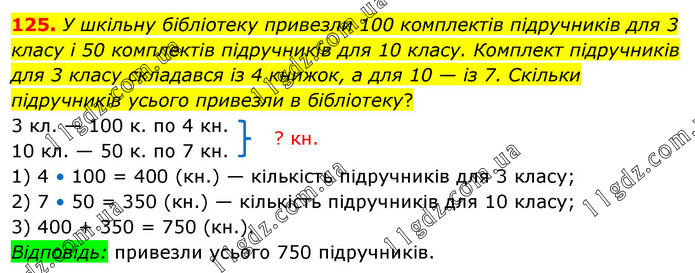 У шкільну бібліотеку привезли 100 комплектів підручників для 3 класу і 50 комплектів підручників для 10 класу. Комплект підручників для 3 класу складався із 4 книжок, а для 10 — із 7. Скільки підручників усього привезли в бібліотеку? 3 кл. — 100 к. по 4 кн. 10 кл. — 50 к. по 7 кн. 1) 4 • 100 = 400 (кн.) — кількість підручників для 3 класу; 2) 7 • 50 = 350 (кн.) — кількість підручників для 10 класу; 3) 400 + 350 = 750 (кн.). Відповідь: привезли усього 750 підручників.