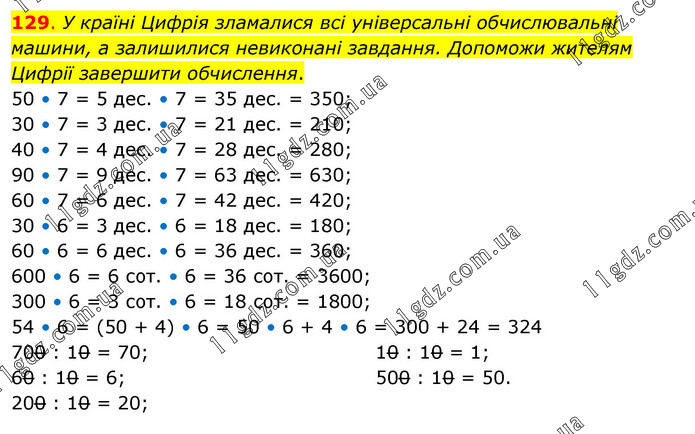 У країні Цифрія зламалися всі універсальні обчислювальні машини, а залишилися невиконані завдання. Допоможи жителям Цифрії завершити обчислення. 50 • 7 = 5 дес. • 7 = 35 дес. = 350; 30 • 7 = 3 дес. • 7 = 21 дес. = 210; 40 • 7 = 4 дес. • 7 = 28 дес. = 280; 90 • 7 = 9 дес. • 7 = 63 дес. = 630; 60 • 7 = 6 дес. • 7 = 42 дес. = 420; 30 • 6 = 3 дес. • 6 = 18 дес. = 180; 60 • 6 = 6 дес. • 6 = 36 дес. = 360; 600 • 6 = 6 сот. • 6 = 36 сот. = 3600; 300 • 6 = 3 сот. • 6 = 18 сот. = 1800; 54 • 6 = (50 + 4) • 6 = 50 • 6 + 4 • 6 = 300 + 24 = 324 700 : 10 = 70; 60 : 10 = 6; 200 : 10 = 20; 10 : 10 = 1; 500 : 10 = 50.